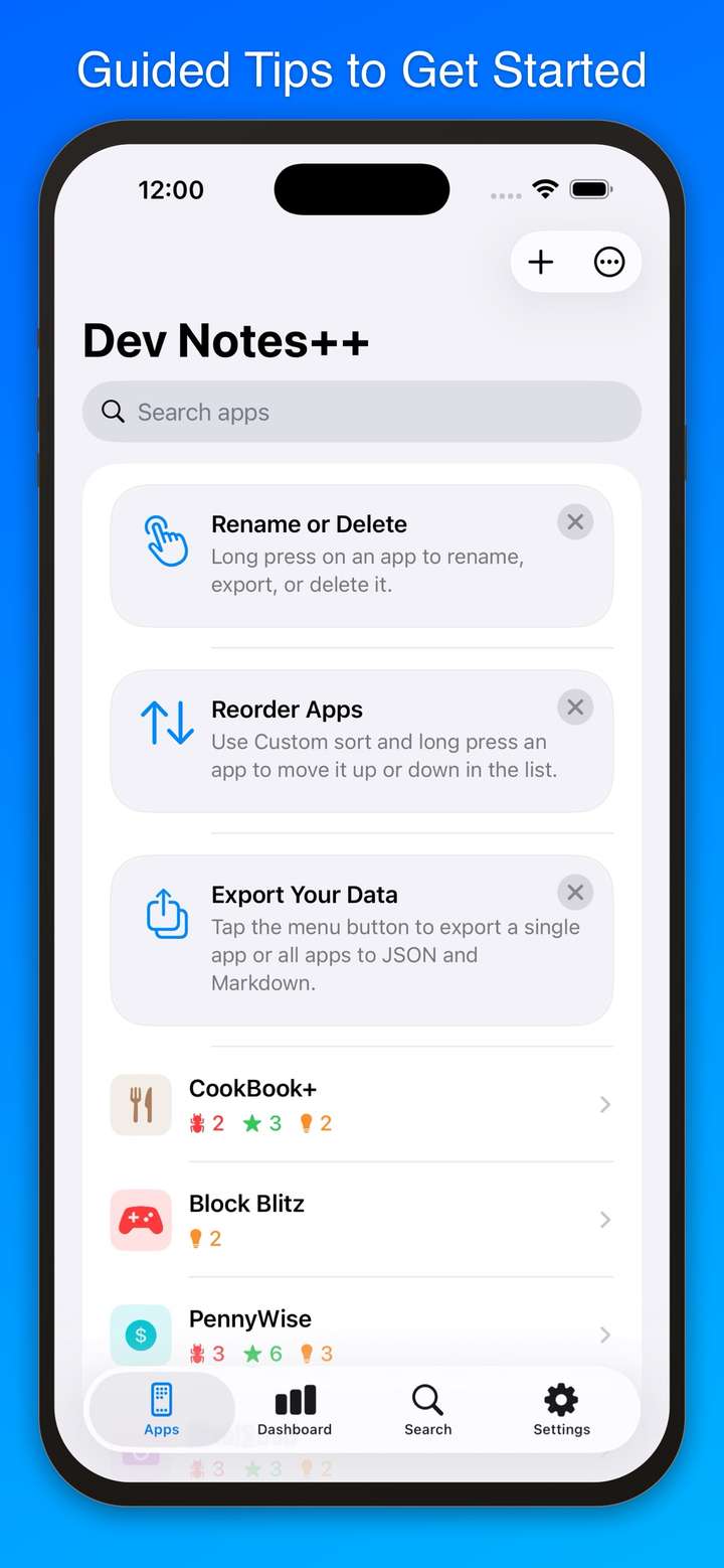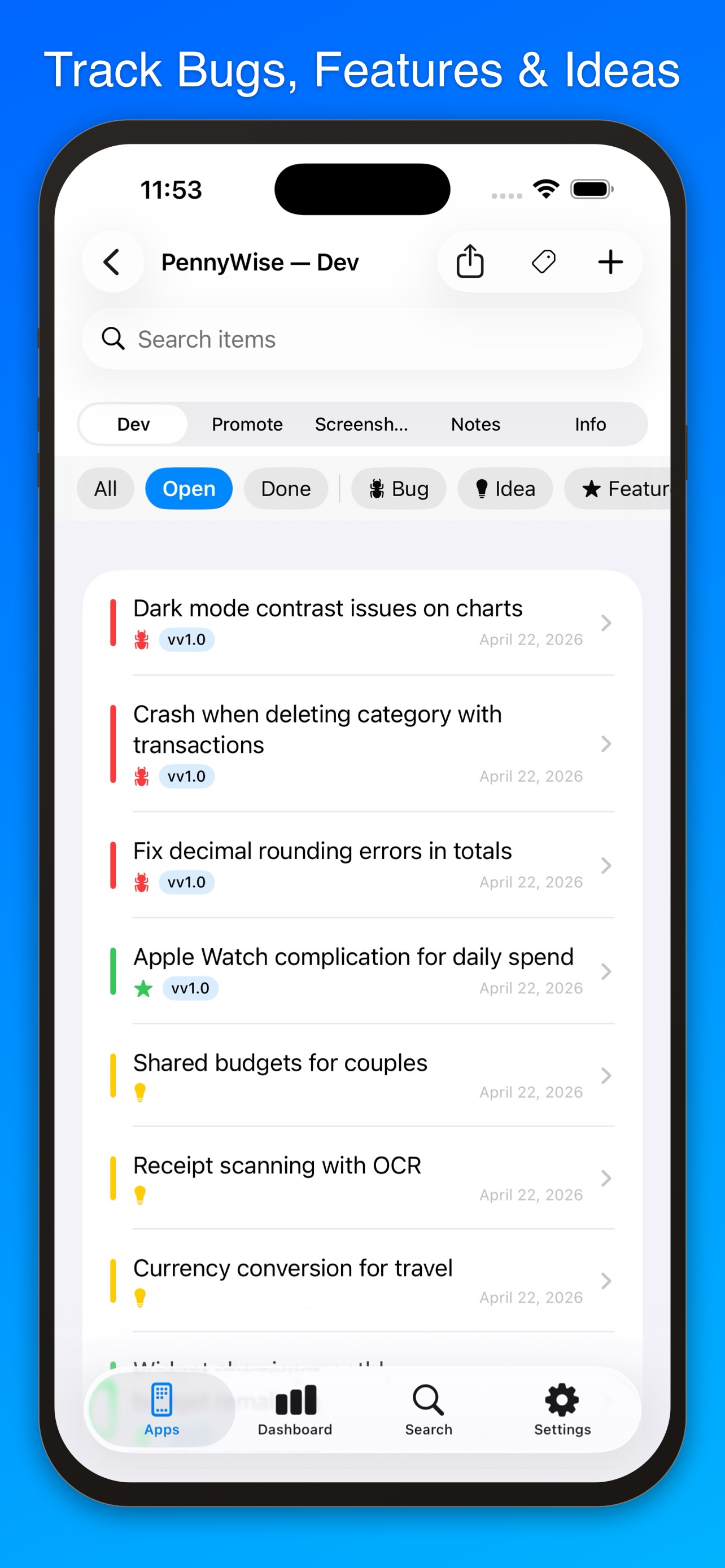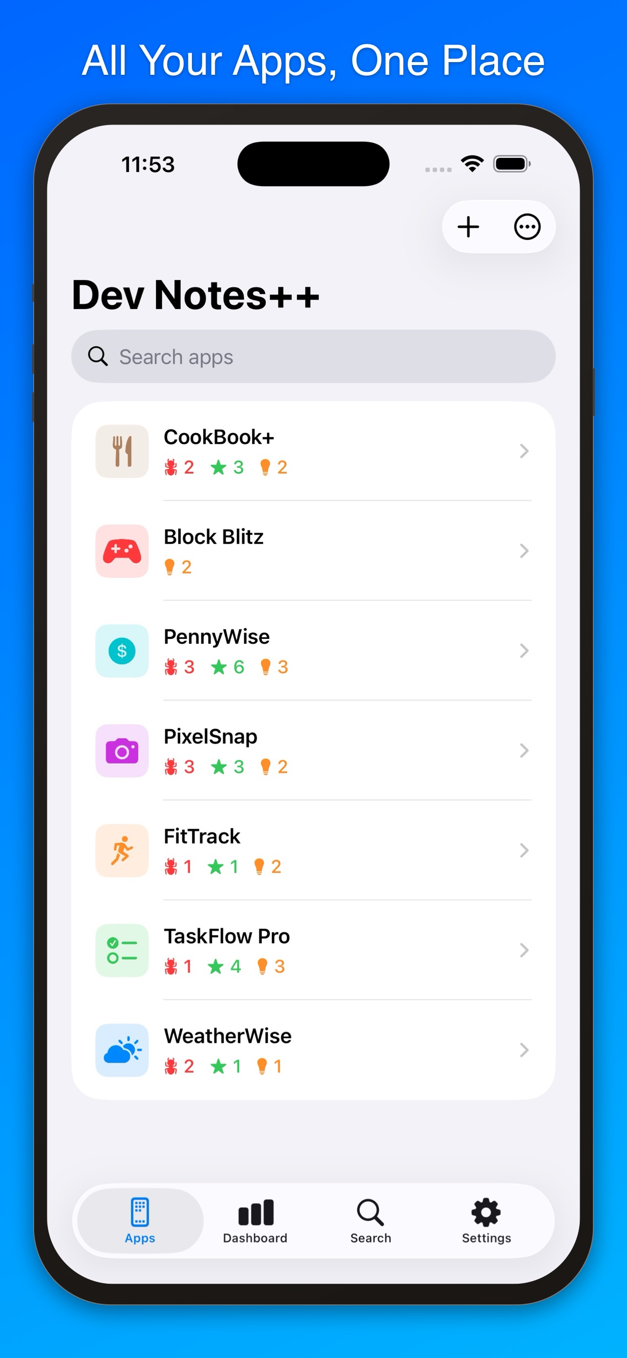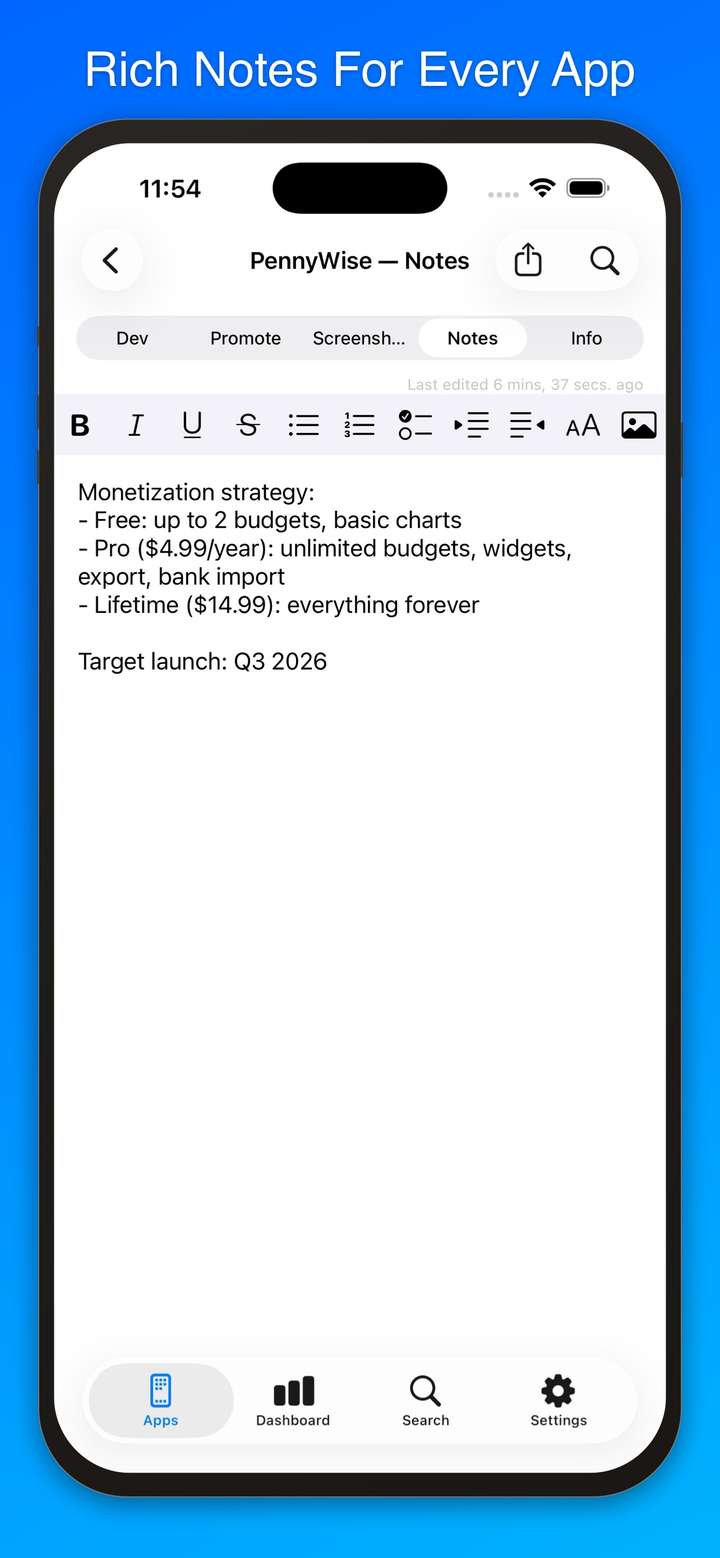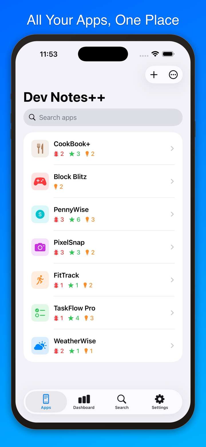 Whether you're juggling one app or ten, Dev Notes++ helps you track bugs, plan features, capture ideas, manage App Store screenshots, draft social media posts, and keep rich notes — all synced across your devices via iCloud.