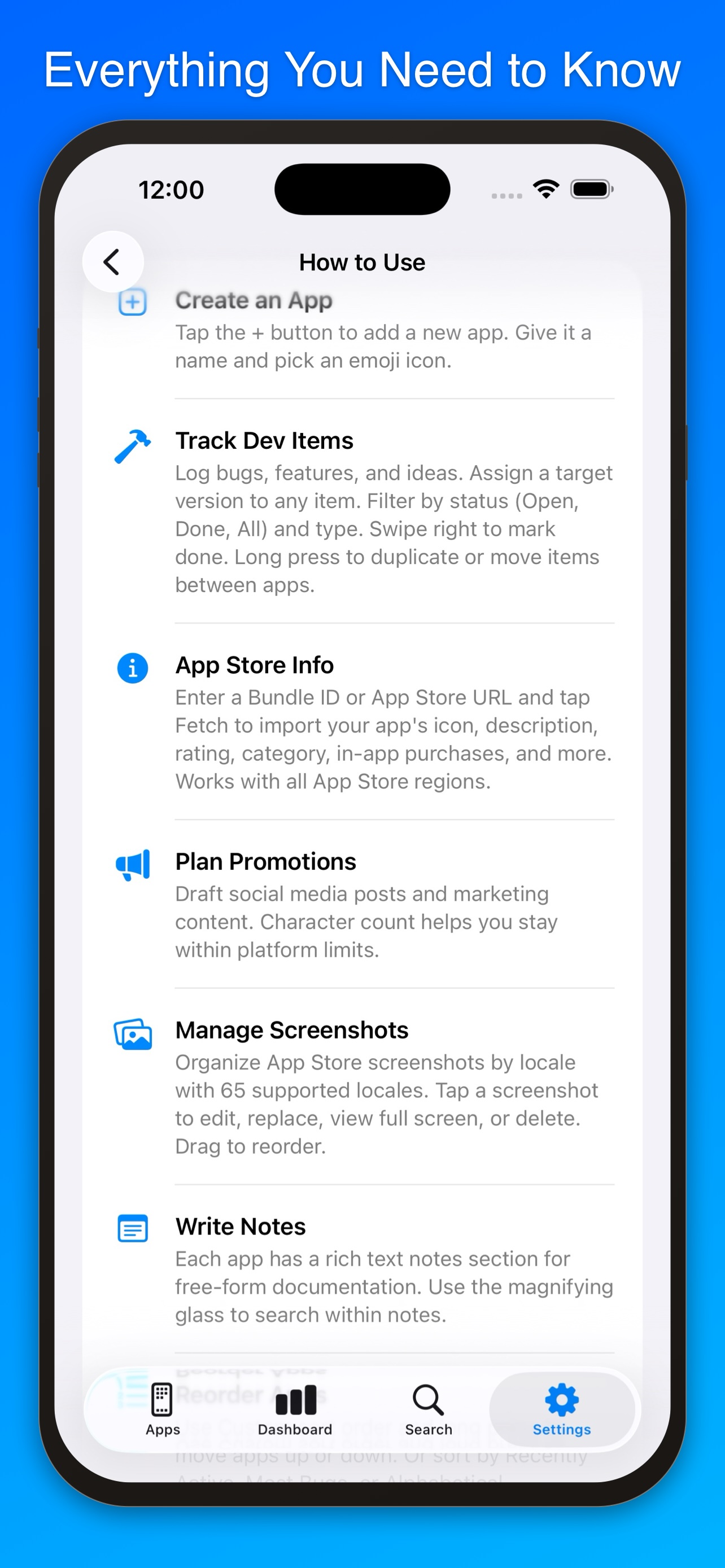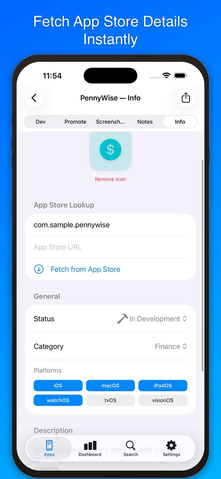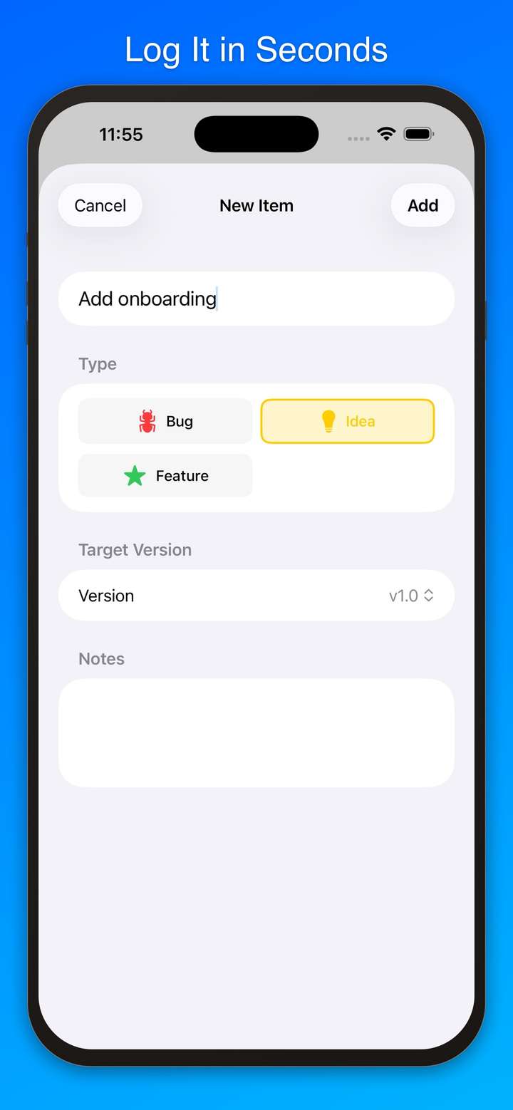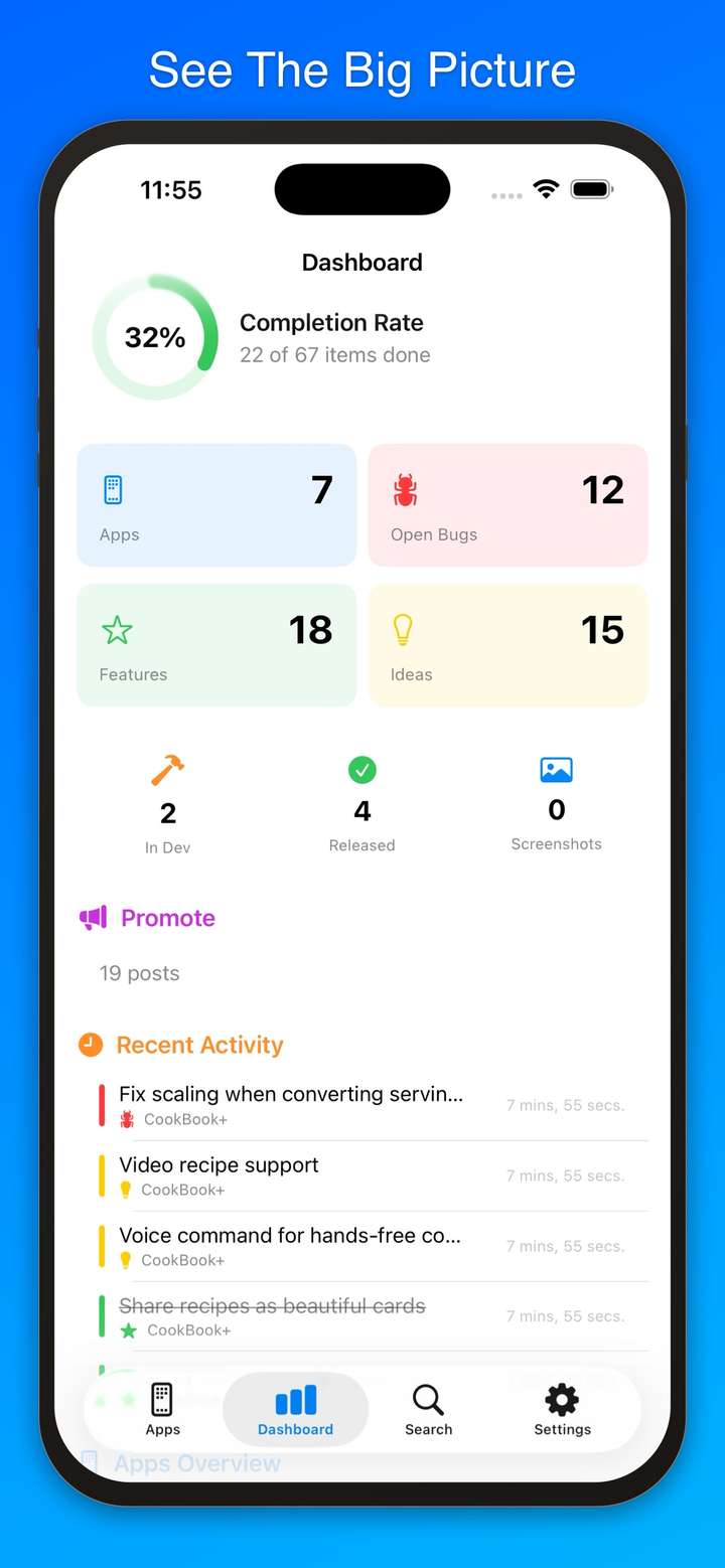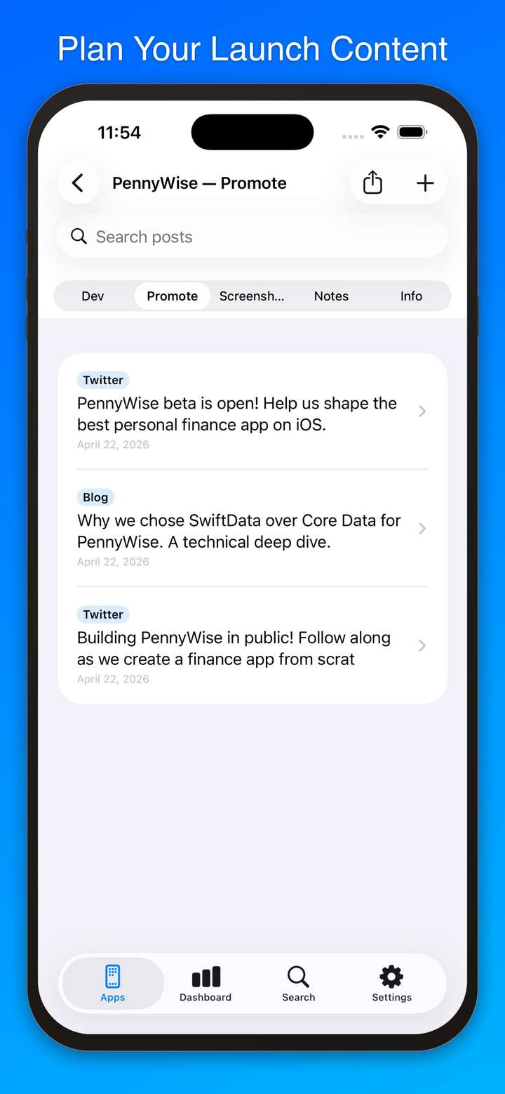Whether you're juggling one app or ten, Dev Notes++ helps you track bugs, plan features, capture ideas, manage App Store screenshots, draft social media posts, and keep rich notes — all synced across your devices via iCloud.
