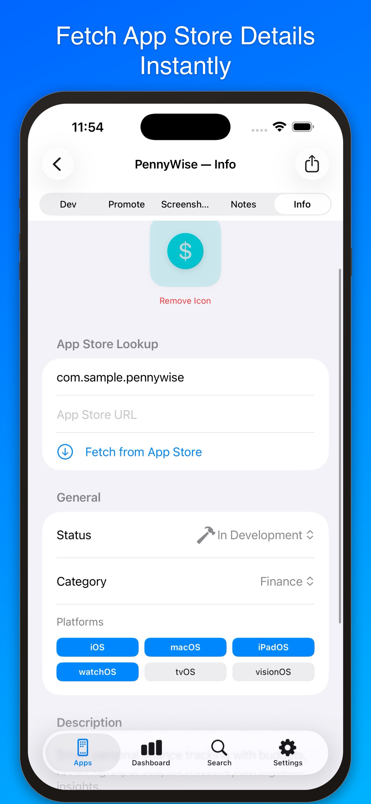 - Enter a Bundle ID or App Store URL to auto-import your app's icon, description, rating, category, in-app purchases, and more