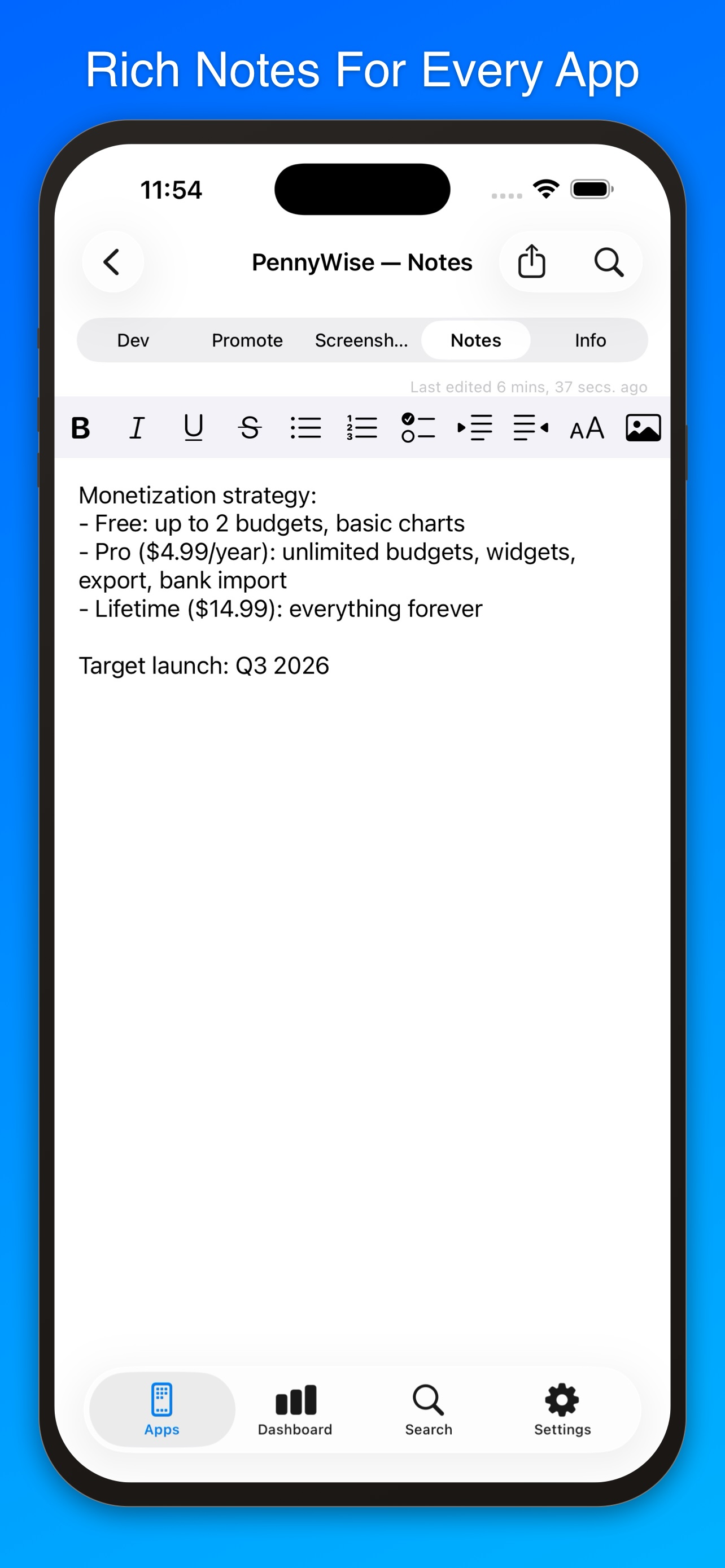 - Free-form rich text notes for each app