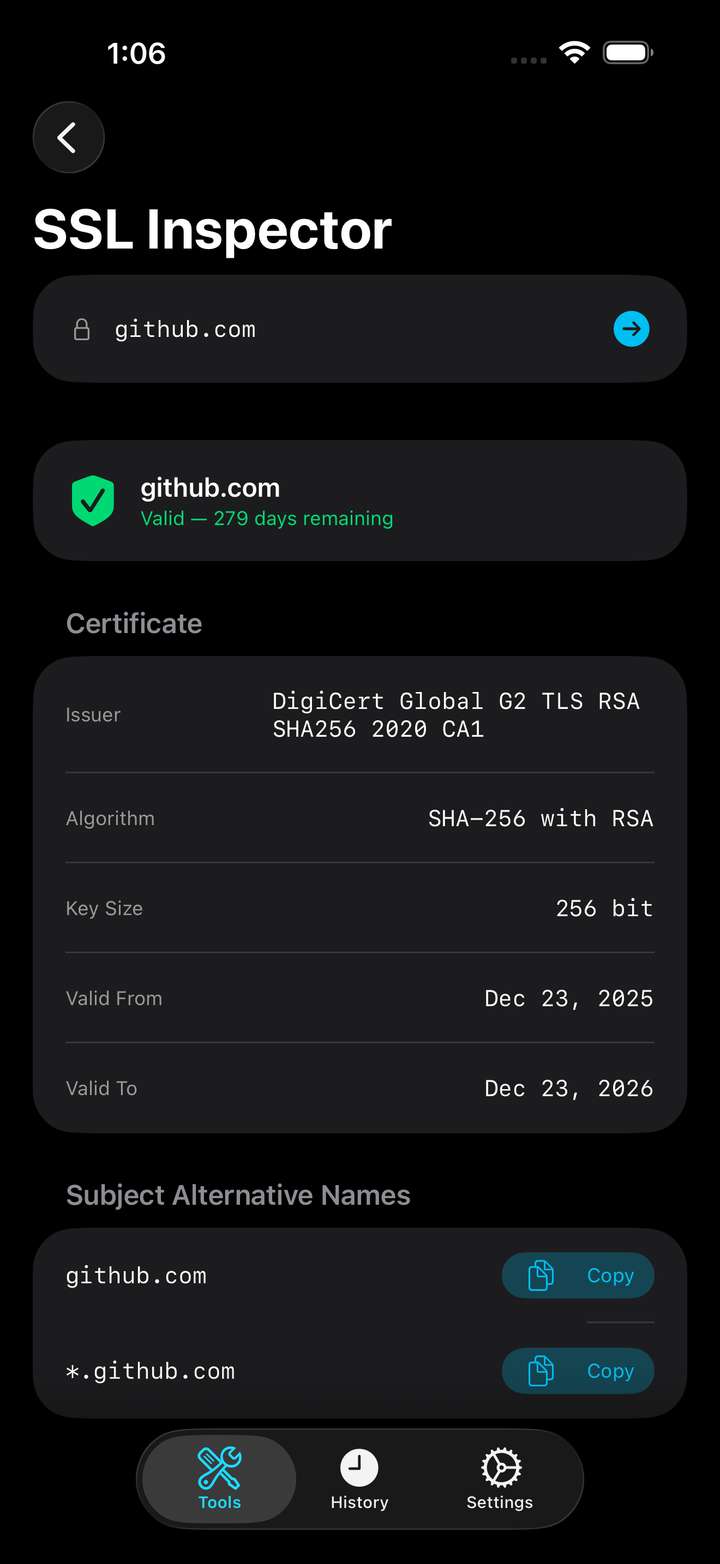 - SSL Inspector — Examine TLS/SSL certificates, expiry dates, and key details