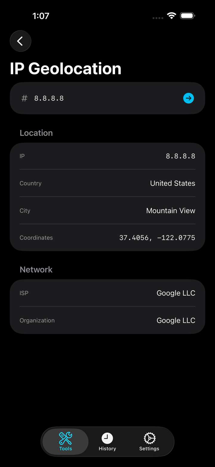 - IP Geolocation — Locate any IP address on the map with ISP and organization details