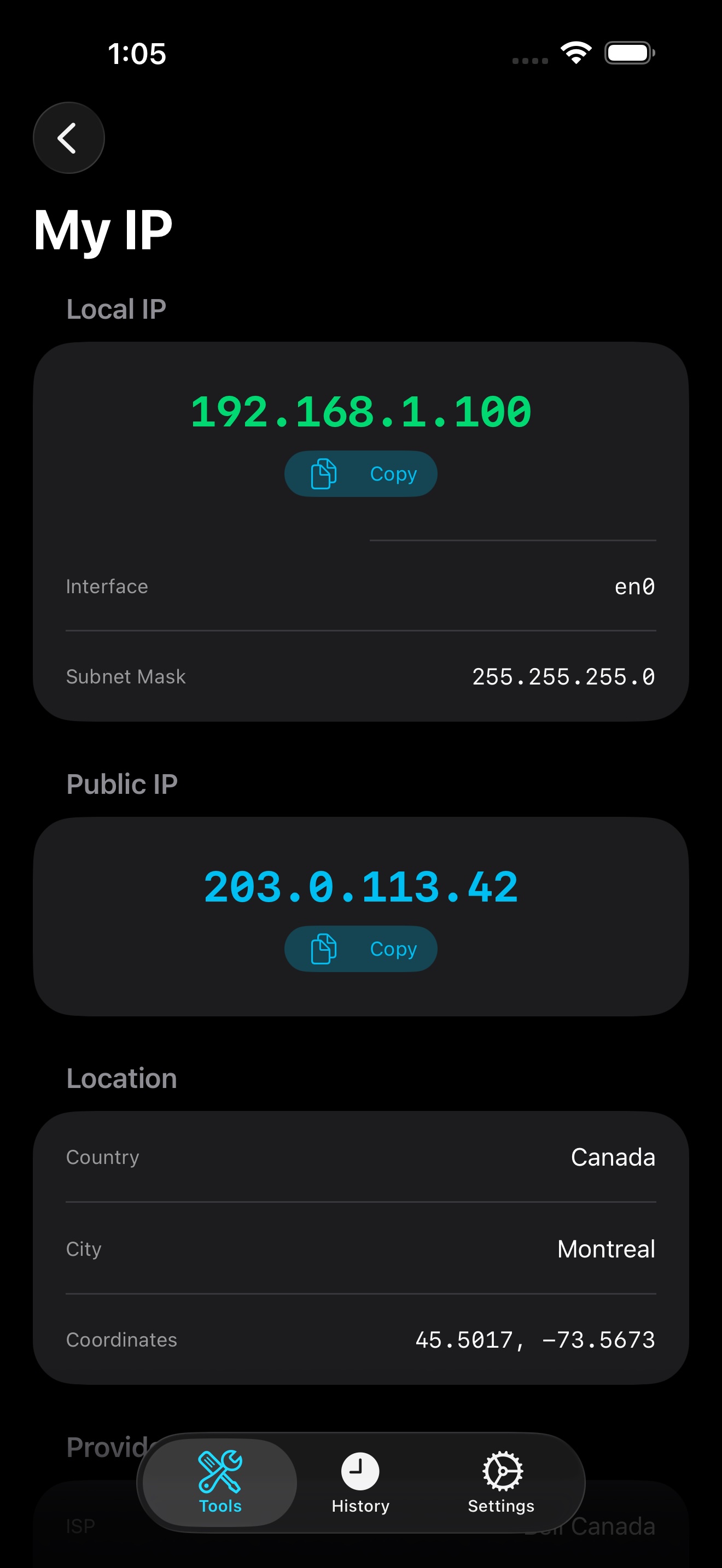 - Network information: The App accesses your device's network interfaces (e.g., local IP address, network adapter name) to display network configuration details in the "My IP" and "Network Scanner" tools.