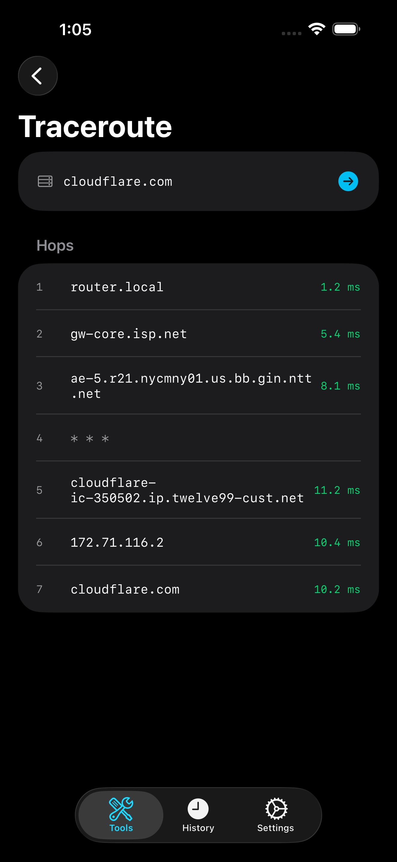Information you provide directly: When you use the App's diagnostic tools, you enter data such as hostnames, domain names, and IP addresses. This information is processed to perform the requested network operations and is stored locally on your device in the tool history. Information collected automatically: