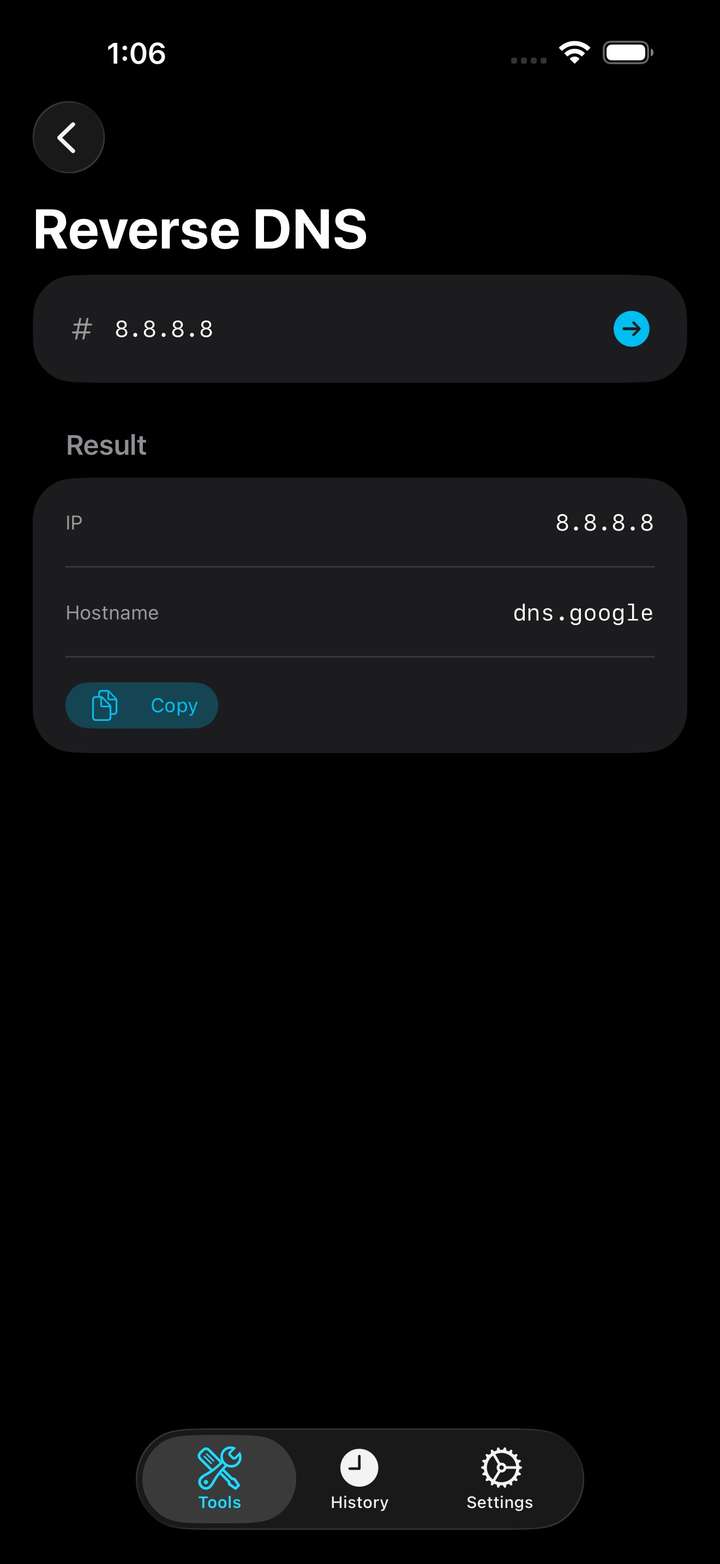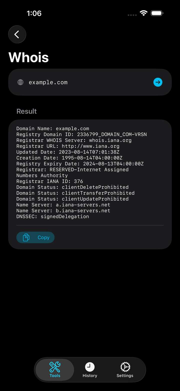 - DNS Lookup — Query A, AAAA, MX, NS, and other DNS record types