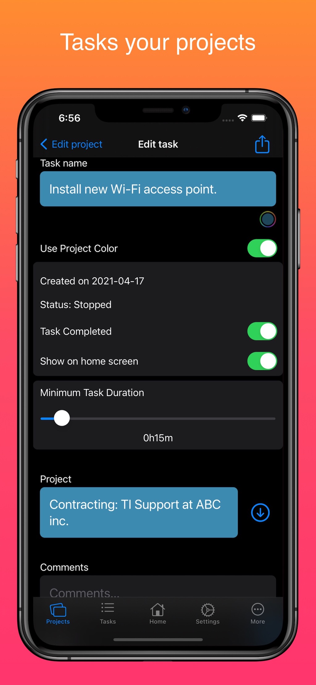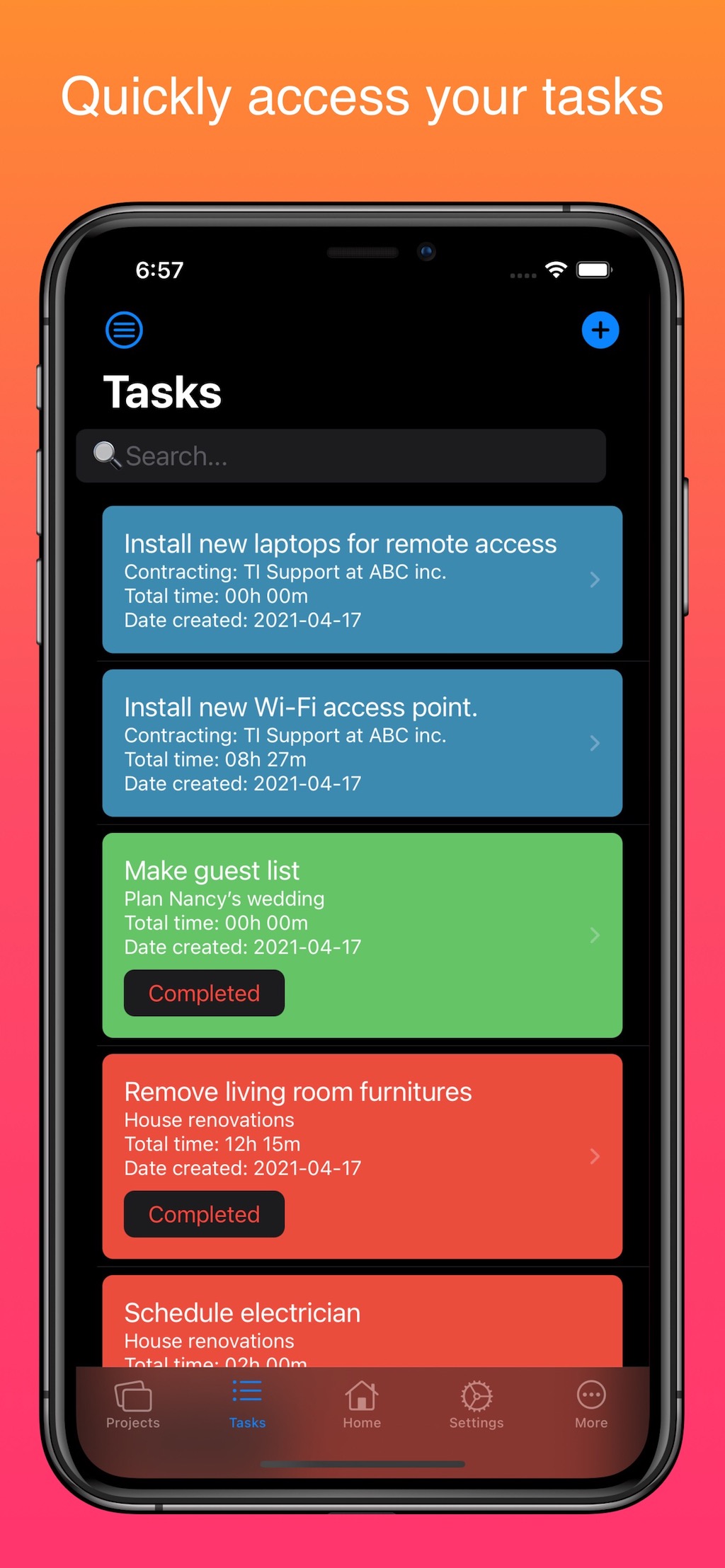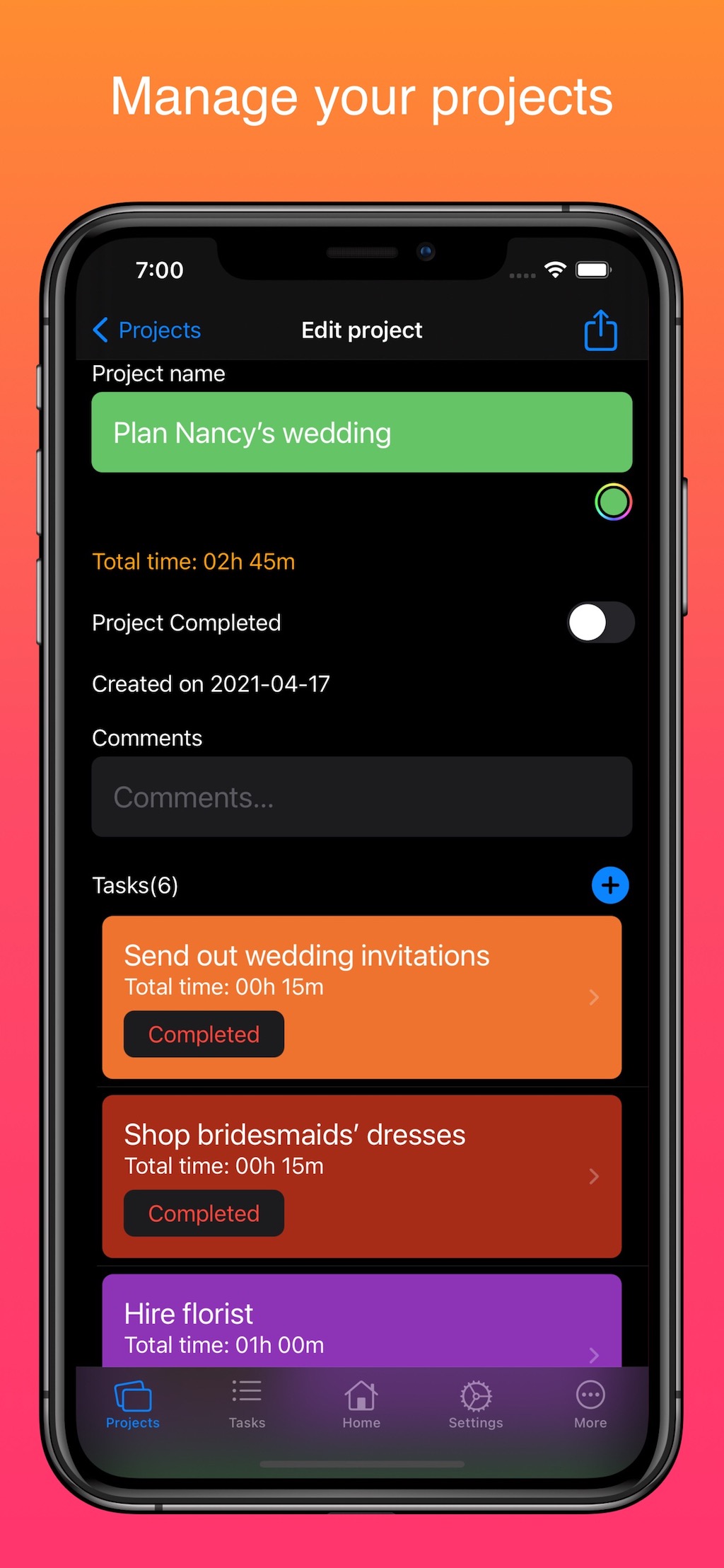 HoursCal lets you manage your projects and tasks easily. In fact, HoursCal can manage any kind of projects and tasks. You simply have to enter a project, add tasks and HoursCal will keep track of all your time spent on your different projects and tasks.